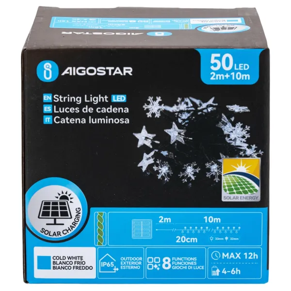 ilumina cualquier espacio con una atmósfera mágica utilizando la guirnalda de luces solares con forma de copo de nieve. este encantador conjunto de iluminación cuenta con una longitud total de 12 metros, distribuidos en un cable de 2 metros más 10 metros adicionales repletos de luces led de color blanco frío, diseñadas con la forma delicada y única de copos de nieve. perfectas para festividades o simplemente para añadir un toque especial a tu decoración diaria, estas luces son completamente energéticamente eficientes gracias a su alimentación solar. esto no solo ayuda a reducir el consumo de energía eléctrica, sino que también hace que la guirnalda sea fácil de instalar en exteriores, ya que no depende de fuentes de energía cercanas. con el panel solar incluido, las luces se cargan durante el día y automáticamente iluminan al caer la noche, proporcionando un brillo encantador hasta por 8 horas en condiciones óptimas de carga. su diseño resistente al agua garantiza durabilidad y rendimiento incluso en condiciones adversas, lo que las hace ideales para jardines, patios, balcones o cualquier espacio al aire libre. celebra la temporada y crea un ambiente inolvidable con estas bellas luces con forma de copo de nieve, el complemento perfecto para tus celebraciones o para darle un toque luminoso y acogedor a tu hogar.